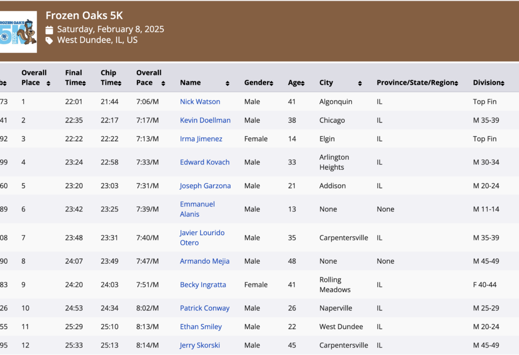 The 6th annual Dundee Township Park District “Frozen Oaks 5K” was without a doubt, one of the most brutal 5Ks that I’ve ever run. My younger brother Brian joined me for the icy suburban showdown. He finishing strong in 19th place. Together we faced a winding gauntlet of sharp turns and punishing climbs laid out across the frozen terrain of the Randall Oaks Golf Course. The record amount of participants weaved up and down the golf cart path which was surrounded by fairways and sandy bunkers. A couple steep hills really burned up my legs. However, even with a painful side cramp…I was able to stay toe to toe with the lead runner for the first two miles. For a moment I thought I might overtake him. But in the final stretch…he surged ahead. I crossed the finish line just behind claiming second place. I was really happy with my performance in the cold temperature. After the race, Brian and I thawed out in the warmth of the banquet hall where the award ceremony brought a sense of celebration to our exhaustion. I ate a hearty bowl of chili with a grin then cracked open my first beer of the year…a well earned reward after surviving Dry January… and one hell of a race.